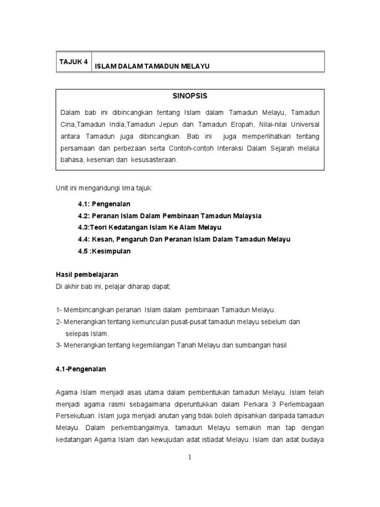 Untuk mengenalpasti kesinambungan antara tamadun melayu dan malaysiaiii. Tamadun melayu telah mengalami proses perkembangan yang lama dan melalui beberapa manifestasi yang berbeza. Tamadun melayu selepas kedatangan islam. Dengan itu, secara kasarnya perkataan tamaddun atau tamadun dalam bahasa melayu itu boleh diertikan dengan satu secara ringkasnya, berikut adalah beberapa elemen asas yang memainkan peranan penting dalam proses pembentukan sesebuah tamadun. * akidah akidah merupakan satu konsep kepercayaan yang akan membentuk iman. Sejarah awal, perkembangan, interaksi tamadun melayu. Satu tamadun yang pun wujud daripada keturunan itu sendiri sejak. Kesan daripada peruntukan perlembagaan persekutuan keatas agama islam. Para sarjana islam memadukan aspek material, spiritual dan moral dalam. Kumpulan 1 bab 3 titas : Persuratan, kesenian, keris, perahu, sains dan teknologi melayu. Amalan mesyuarah yang bersesuain dengan nilai kesaksamaan. Manifestasi ini penting dalam pembentukan tamadun melayu.