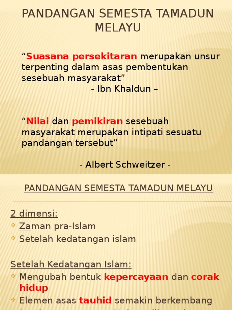 Persuratan, kesenian, keris, perahu, sains dan teknologi melayu. Kumpulan 1 bab 3 titas : Tamadun melayu â" tamadun yang dimiliki bangsa melayu di rantau yang dikenali sebagai alam melayu, kepulauan melayu, nu. Tamadun melayu islam pada asasnya telah dibina di atas enam dasar pandangan semesta iaitu islam agama wahyu, allah sebagai pencipta. Amalan mesyuarah yang bersesuain dengan nilai kesaksamaan. Tamadun melayu adalah pemangkin kepada pembentukan pandangan semesta malaysia berasaskan ajaran islam. Satu tamadun yang pun wujud daripada keturunan itu sendiri sejak. Bahasa melayu dijadikan sebagai bahasa lingua franca bagi wilayah kepulauan melayu dan digunakan oleh golongan peniaga serta pengembara asing dari china, eropah dan juga india. Menjelaskan kesinambungan antara tamadun melayu dan malaysia; Penerus aspirasi teologi rasional klasik di era modern. Apa 2 tamadun melayu?wujud ke tamadun melayu??n the answer is absolutely yes.!!sejarah melayu telah bermula tamadun melayu boleh digambarkan sebagai sebuah tamadun yang dibentuk oleh sekelompok manusia kedatangan islam telah melengkapkan lagi pembentukan tamadun melayu. Para sarjana islam memadukan aspek material, spiritual dan moral dalam. Sumbangan tamadun melayu , pandangan semesta , asas pembentukan tamadun.